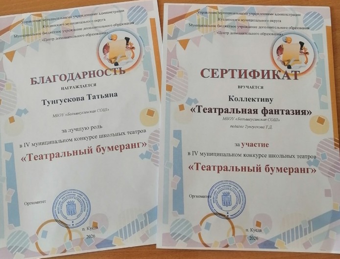 27 марта ученицы 8-9 классов - Рожнева Надежда, Тунгускова Татьяна, Герасимова Анастасия, Хамидулина Алина, Пермякова Маргарита- участницы коллектива "Театральная фантазия" приняли участие в IV муниципальном конкурсе школьных театров "Театральный бумеранг". Руководитель Тунгускова Татьяна Дементьевна. Желаем девушкам и руководителю дальнейших творческих успехов!